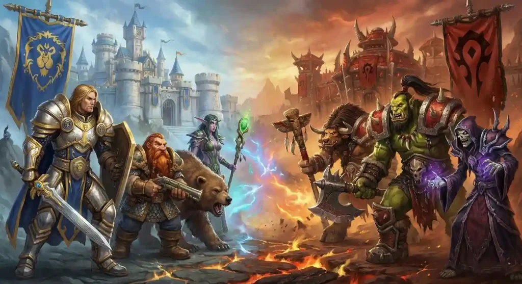 در WoW، انتخاب کلاس و نژاد شخصیت شما اهمیت زیادی دارد. هر کلاس تواناییها و مهارتهای خاص خود را دارد و نژادهای مختلف نیز ویژگیهای منحصر به فردی (Racial Traits) ارائه میدهند. بازی حول محور درگیری دو جناح اصلی میچرخد: